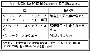 各国でも、それぞれのやり方で電子媒体の記録を情報公開の対象文書としてきた。それをまとめたのが表 1である。解釈上、対象文書に含めている国々の中でも、一定の準備段階のものや内部使用文書をのぞいたりするなど、ばらつきがある。アジアで初の情報公開制度を制定した韓国では、コンピューターにより処理される媒体も公開される情報に含まれているが、電子メールによる情報請求は本文の中には規定されていない(ただし、大統領令によって可能になっている)。米国では、従来の情報自由法(Freedom of Information Act)の下では、解釈運用上あるいは判例上、電子的記録を情報公開の対象に含めていたが、これをEFOIAによって明確にし、さらにいくつかの改正を行ったのである。