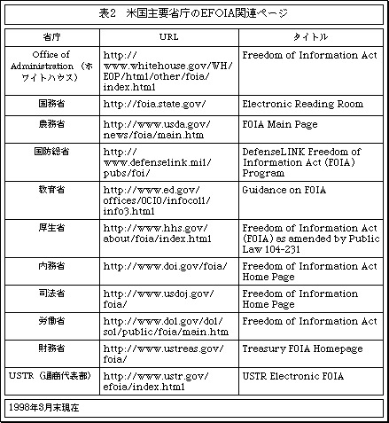 実際にEFOIAによってどのような変化が起きているのだろうか。表 2は、米国の主要省庁のEFOIA対応ホームページをまとめたものである。主要省庁に限らず、独立行政機関を含めて、EFOIAに対応するホームページを整備し始めている。